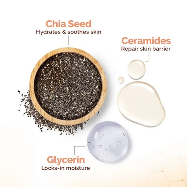 Chiazaden, rijk aan vezels en essentiële vetzuren, helpen de huid te hydrateren, te kalmeren en te beschermen tegen uitdroging en omgevingsstress. -